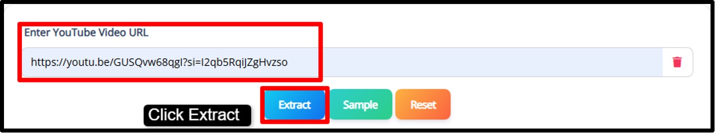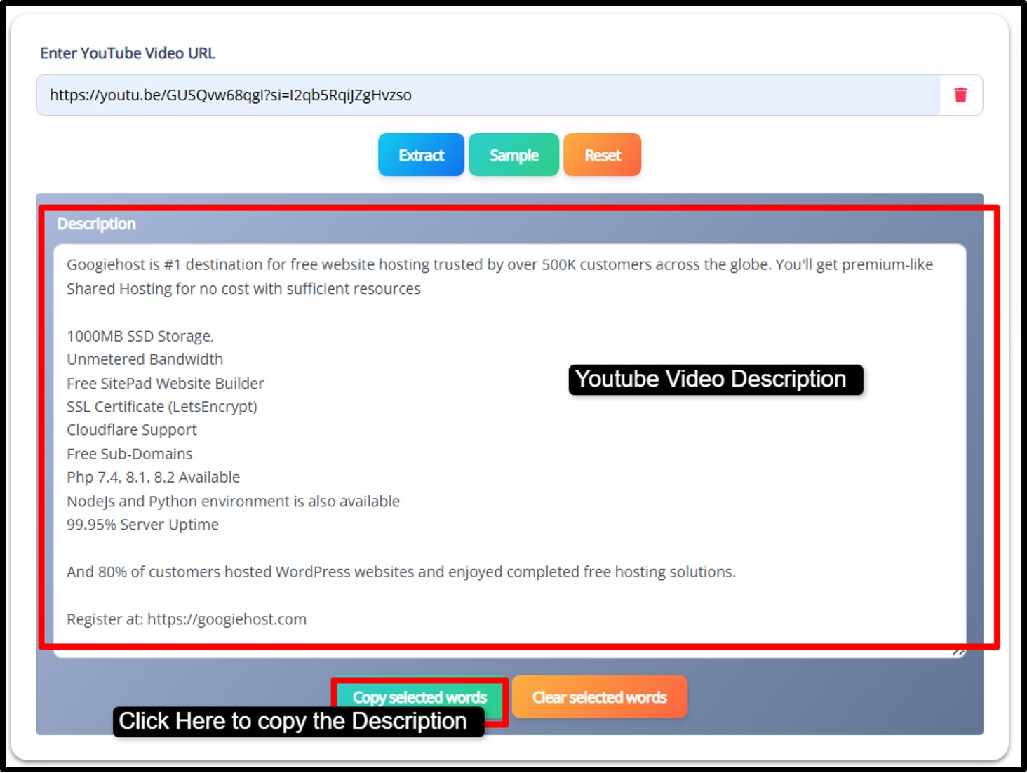 Step3) Click Extract >> Hit the extract button >> The tool will instantly pull the full video description for you.